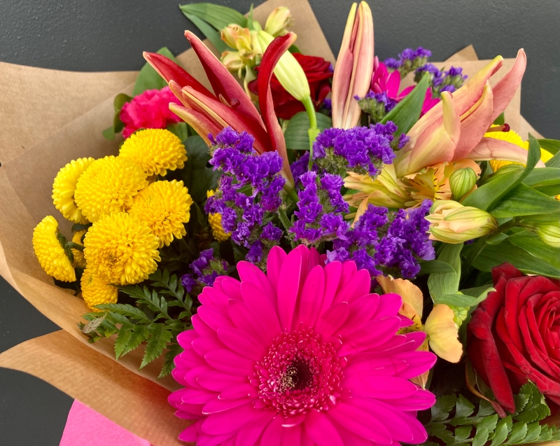 A selection of the brightest most colourful blooms of the day, featuring hot pinks, yellow, purple etc..