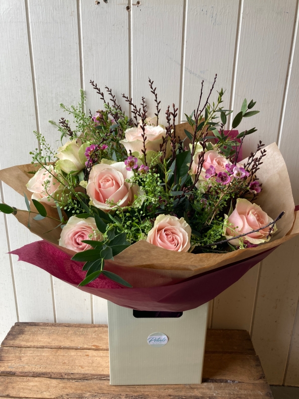 A dozen premium blush pink roses, surrounded by pink wax flowers and luscious foliage.