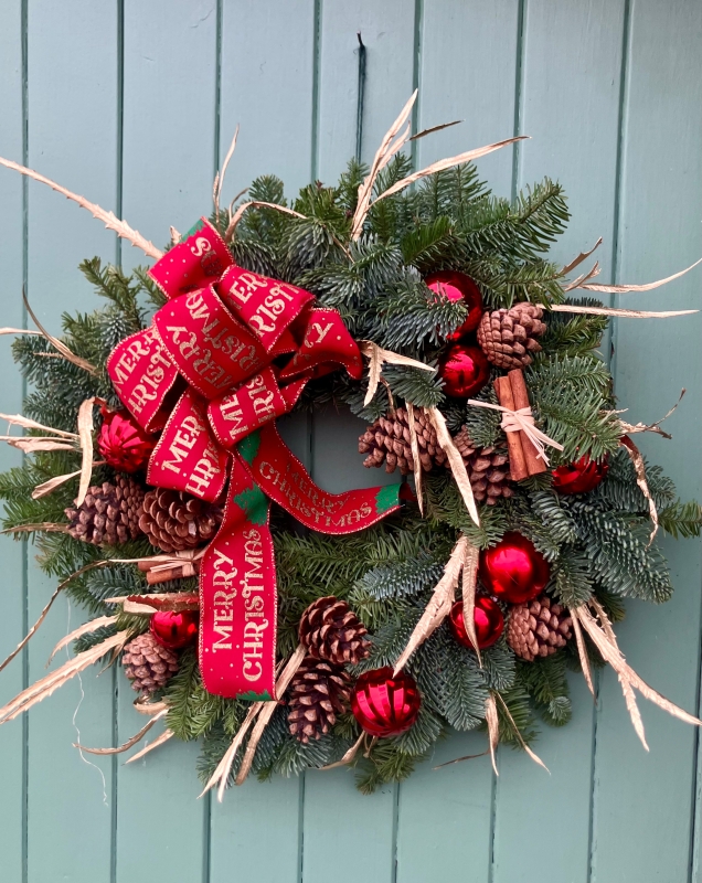 Fresh nobilis wreath decorated with pine cones, cinnamon, berries and painted dried grevillea.