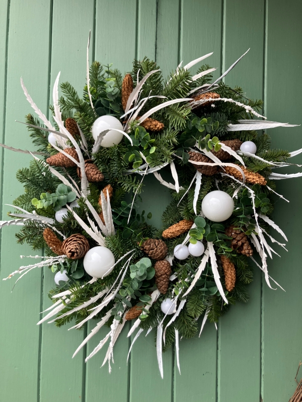 Icy whites, painted grevillea, faux eucalyptus, pine cones and baubles on a fresh nobilis wreath