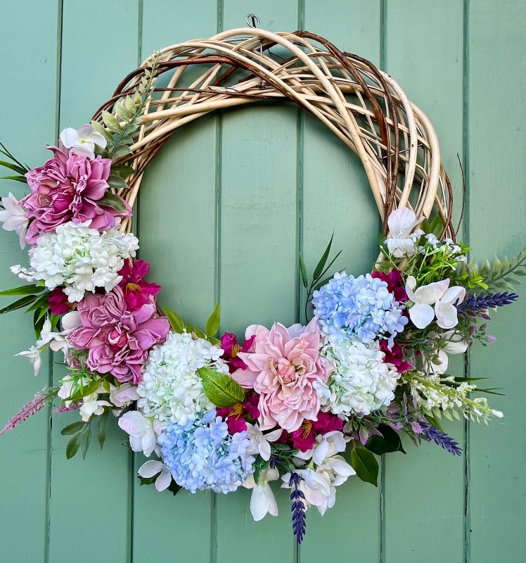 Natural woven wreath base decorated with faux dahlias, viburnum, veronica and a hint of raspberry. 40cm diameter.